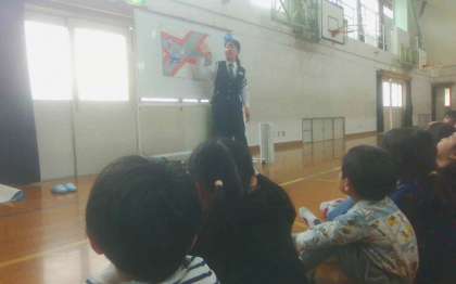 みんなで体育館に集まり、安全のお話を聞きました。車やバイクが来ていないか右・左をよく見て横断歩道を渡ることや、手を挙げて渡ることを確認しながら、歩き方を練習しました。警察の方からは、「止まる」ことがとても大切だと教えていただきました。事故に合わないよう、安全に気をつけて登下校してほしいです。