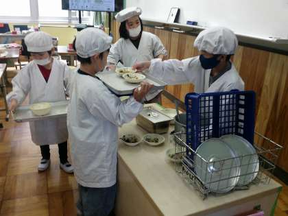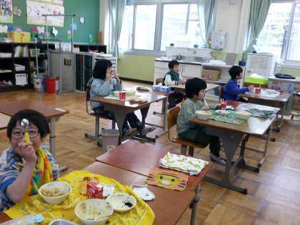みんなで給食室に給食を取りに行っています。おかずを入れる子、ご飯を入れる子、牛乳を配る子、お盆で配る子、ストローを配る子など自分たちで決めた役割を頑張ってこなしています。おいしい給食を食べるために、エイエイオ—。今日もおいしくごちそうさまでした。
