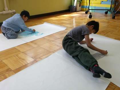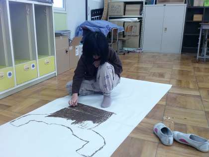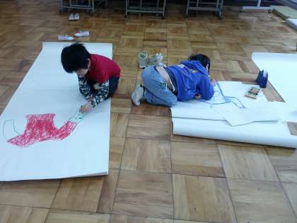 今日は 図画工作「自分をかこう」の学習をしました。人形を使って見本を見せて、いざ、一人ずつ隣の教室に。模造紙2枚分を張り付けた紙に躊躇しながら…ゴロン。好きなポーズをとったら、担任が全身の型を取りました。5人分の型をとったら、着ている上着の色を確認し、クレパスで塗りこんでいきました。かっこいい自分になるようにと、集中して色を塗っていました。次は、ズボン、靴…と続きます。