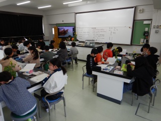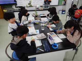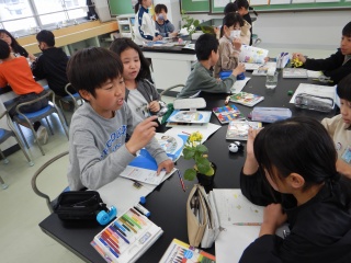 アブラナの花を細かく観察する学習に取り組んでいる様子です。とても小さな花ですが、花びら1枚1枚、おしべとめしべも一つずつ丁寧に取り分けて、様子をじっくりと調べました。おしべの先を触ると、黄色い花粉がたくさんつくことにも気付きました。
