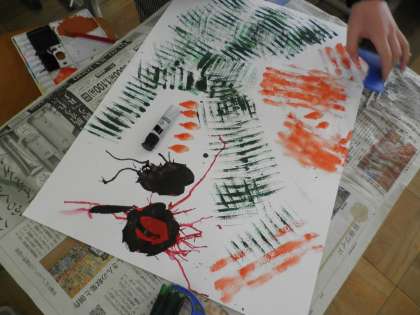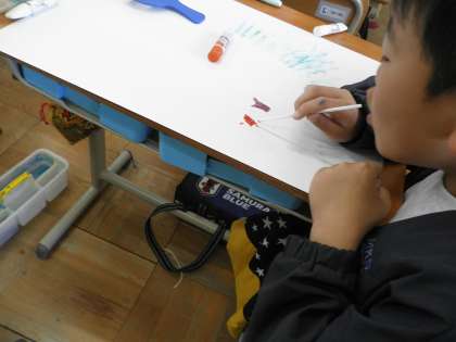 今週水曜日図画工作科で「絵の具でゆめもよう」の学習に取り組みました。あみとブラシで絵の具をはじいて描いたり、ストローで絵の具を吹いて吹き流しをしたり…みんなとても楽しそうに学習していました。