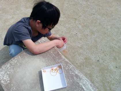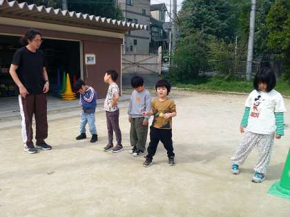 今日はランニングに足が進まない子ども達。「今日は、よ〜いドン!!で走るよ。」とスダンディングスタートを教えてもらったとたん、顔が真剣になり目標回数まで走ることができました。「1週走ったらゴムを一個つけるよ。何週走ったか分かりやすいよね。」でスピードが上がり、走り終わった後にはみんな真っ赤な顔でした。頑張って走ったごほうびに、疲れた体でゴムの片づけもしてくれました。