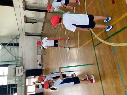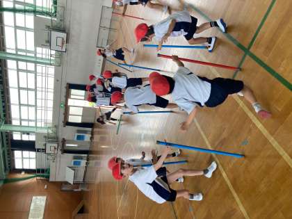 棒を使っての体ほぐし運動にもチャレンジしました。倒れないように隣の棒まで進みます。見た目よりも難しく盛り上がりました。
