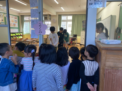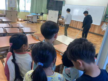 はじめての教室掃除をしました。6年生の箒の使い方を見て、学びました。きれいに掃いてもらった後、友達と協力しながら、机運びをしました。