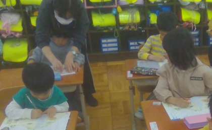 国語の授業で、鉛筆の正しい持ち方や正しい姿勢を学習しました。いろいろな線やひらがなをなぞる時にも、学習したことを生かして頑張りましょう。