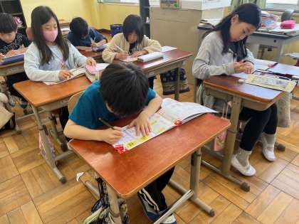3組の漢字学習の様子です。1画1画丁寧に書いています。集中して取り組む姿勢が素晴らしいです!3年生で学習する漢字は200字、たくさんの漢字を覚えます。新しい言葉に触れ、どんどん語彙を増やしていきます。