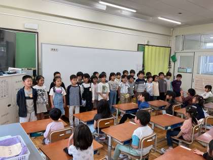 今日は、1年生へ2年生からメダル・校歌・朝顔の種のプレゼントを渡しに行きました。