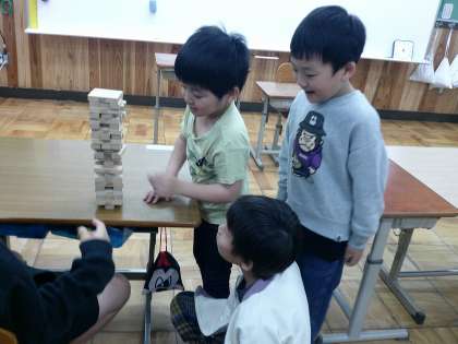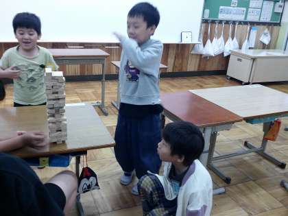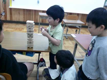 雨の日の訪問者、今日は4年生の男子がのぞきに来てくれ、一緒にジェンガを楽しみました。みんなルールを守り楽しく遊んでいました。とてもいい時間が過ごせました。