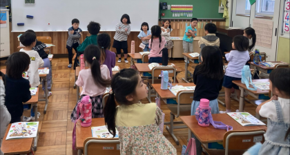 音楽の学習では、友達と一緒に歌ったり、踊ったりしています。