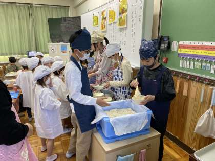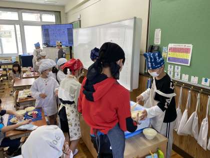 1年生の配膳をお手伝いするのが今日から始まりました。1年生は6年生の入れ方や運び方を見て学び、徐々にできるように練習をしていきます。6年生が良い見本を見せ続けることが1年生の大きな学びになります。どの人が手伝いに行っても、1年生の先生の話をしっかりと聞いて、テキパキ動いてくださいね!よろしくお願いします。