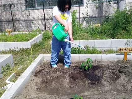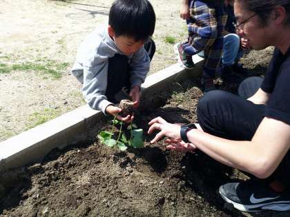 畑の土も熟成されました。そこでピーマンと枝豆の苗を植えました。先生の話のとおり手をしっかりパーにして、逆さにしたポットの苗を優しく受け取めていました。真剣そのものでした。毎日しっかりお水をあげましょうね。