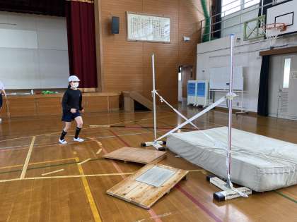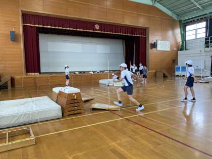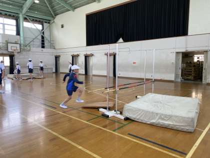 高跳びは練習の時間に入りました。ゴムの場、跳び箱の場、バー2本の場など自分に合った場を選んで練習をします。足を引き上げる、助走のリズムを意識するなど、それぞれの大切なことを抑えながら、さらに高いバーを越えられるように頑張っていきましょう!