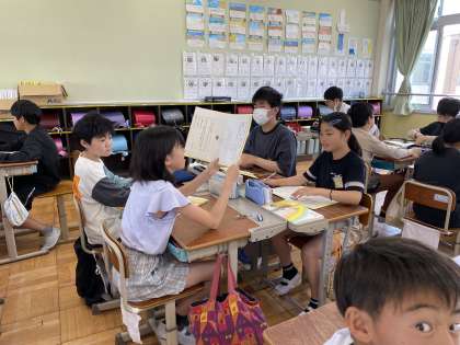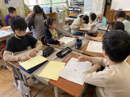 国語科は『聞いて、考えを深めよう』という単元に入っています。今回は、自分の思う学校の良いところを考え、グループで共有しました。自分の思うその良いところを、学校にかかわる人にインタビューすることを通して、それに対する自分の考えを深めていきます。次回、自分の考えを整理しながら、インタビューをする内容を考えていきます。