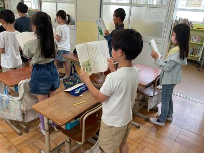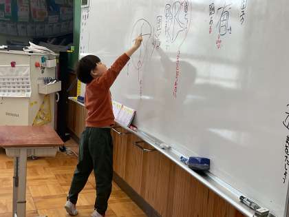 国語の様子です。漢字の学習では、筆順や気を付けるポイントをみんなで確認しながら丁寧な字を書いて頑張って学習しています。音読も、回数を重ねるうちに、言葉のまとまりに気を付けてすらすら読むことができるようになってきました。いい姿勢で頑張っています!