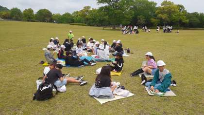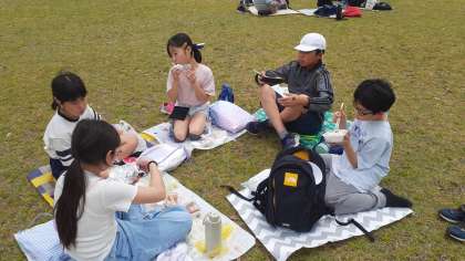 芝生広場で楽しくお弁当をいただきました。徳島の天気もよく、とても気持ちがよいです。お昼からの活動も楽しみです。