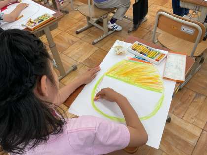 「ふしぎなたまごはどんな形や色かな?」と問いかけたところ、「丸!」「四角!」「虹色!」などたくさんの答えがかえってきました。たまごかの中からどんな世界が生まれてくるかを考えながら、今回はたまごを描きました。クレパスの色を混ぜたり、ティッシュで色を伸ばしたりといろいろな工夫を施すことができました。
