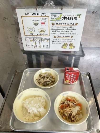 給食でも、この記念日に合わせ、沖縄県の郷土料理「油あげのチャンプル」、「クーブイリチー」が登場します。