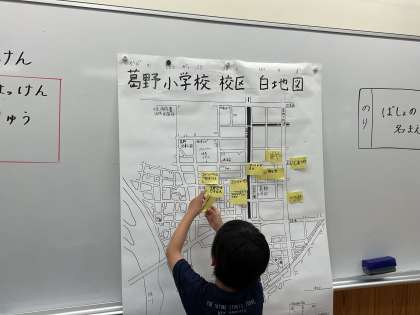 先日の町探検で見つけたお店や施設を、校区地図に付箋で貼りだしました,
