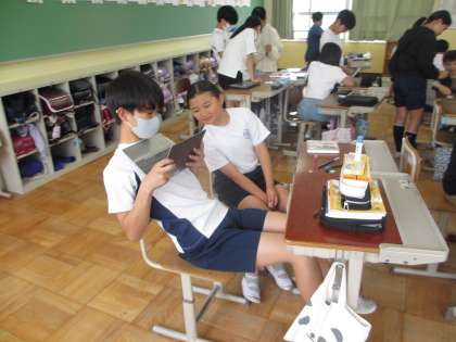 5年生は図画工作科「形に命をふきこんで」の学習でタブレットを使って、1コマ1コマ写真を撮りました。友達と交流しながら、いろいろ工夫を試みる姿が見られました。アニメの動きもこのようにして作られているのか〜という感想がありました。