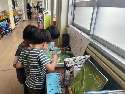 理科「チョウを育てよう」の学習で、モンシロチョウを育て、観察していきます。興味を持って学習に臨めるように、廊下に「理科コーナー」を作って、いつでも卵や幼虫を観察できるようにしました。さっそく虫眼鏡を使って卵を探したり、本を手に取っている姿がありました。