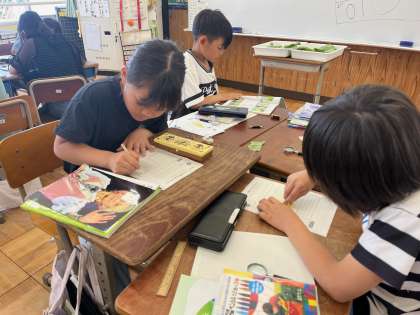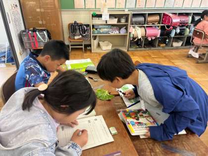 理科の様子です。モンシロチョウの観察を頑張っています。卵の色の違いにも気づき、薄い色は産み付けられたばかりの卵、濃い色はもうすぐ生まれそうな卵ということも学習しました。学習が終わった中間休みには、「先生!幼虫が生まれました!」という元気な報告も聞こえました。これからクラスごとに大切に育てていきます。