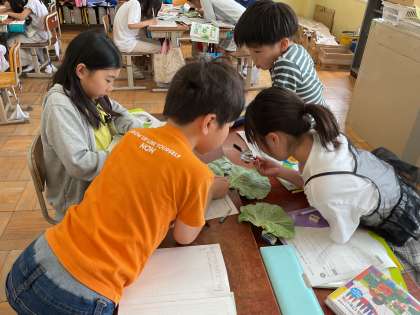 モンシロチョウの卵の観察をしているときに、キャベツの葉にすでに生まれた幼虫が付いていることに気付きました。「幼虫が付いてる!」「どれ?見せて!」と盛り上がっていました。黄色の幼虫と、緑色の幼虫がいることにも気づき、「生まれたときは卵と同じ色なのかな?」と考えをふくらませていました。