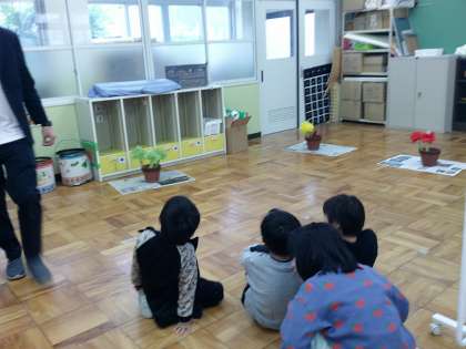 わかばの奥の教室に入ると、「何かいつもと違う…」そうです、教室にお花が咲いています。お花の中には、なんとQRコードが…。QRコードを開いてみると、なんと昆虫たちの体が、360度グルグル回せるではありませんか!