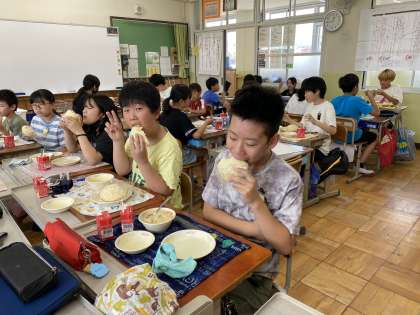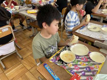給食の献立にメロンパンが出ました。いつものパンとは違うので、子どもたちも大喜びでした。おかわりしに来た子もたくさん!とっても美味しかったです。