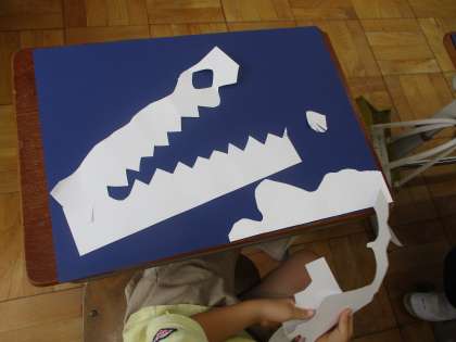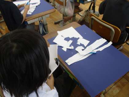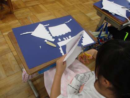 画用紙を気の向くままに自由に切って出来た形を眺めてみます。何に見えるかな?ただのギザギザがだんだんかっこいい牙に見えてきたぞ。これは何に見えるかな?あれれ,波の形に見えてきた。想像を膨らませながら楽しい作品を作りました。