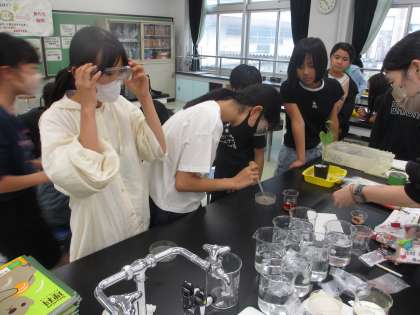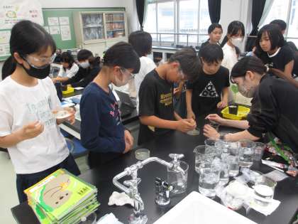 理科で「なぜ子葉はしぼんでしまったのか」について、各班で予想をたて、種子にデンプンがあるかどうかの実験をしました。色濃く反応が出た班と薄い反応しか出なかった班があったようです。予想通りだった班から歓声が上がっていました。