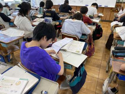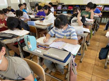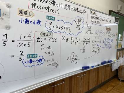 算数科『分数×分数』では、辺の長さが分数のときでも面積や体積を求める公式が使えるのかを確かめました。分数を小数に直して計算し、その答えと分数×分数で求めた答えが一致したので、辺の長さが分数のときにも公式が使えることが分かりました。練習問題を解いた後は自学タイム!計算ドリルやもっと練習の問題など、自分に必要な問題を選んで、時間いっぱい解いていました。計算の力、どんどん付けていきましょう!単位ミスには要注意!