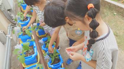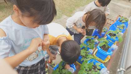 毎朝、朝顔に水やりを続けている子ども達。本葉が数枚出てきて、植木鉢が窮屈そうになってきたので、間引きをし、追肥をしました。もっともっと大きくなるように、引き続きお世話を続けていきましょう!