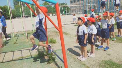 久しぶりに遊具を使って体を動かしました。以前に遊具で遊んだ時より、手や足を上手に使えるようになっていました。特に、のぼり棒を上手に登れるようになった子が多く、「すごーい!」と歓声が上がっていました。次は、休み時間に遊ぼうね。