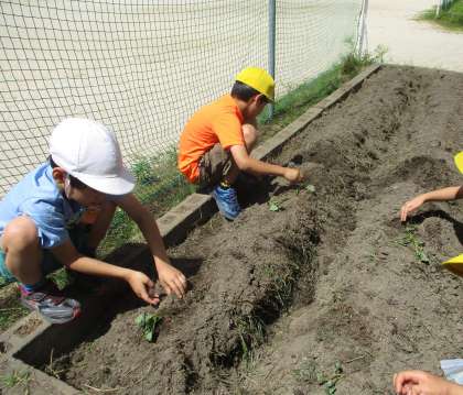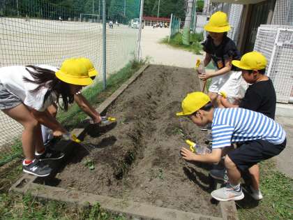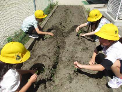 2年生の畑にサツマイモの苗を植えました。初めて見るサツマイモの苗に子どもたちは「え!横向けに植えるの?」「本当にこんなヒョロヒョロの草からおいもができるの?」と大騒ぎです。みんなで協力して、苗を無事植終えることができました。秋にはおいしいおいもができるようにこれからみんなでお世話をがんばります。