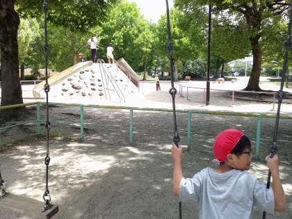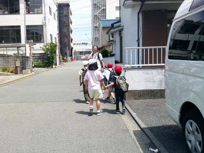 町探検日和の中、約束事を確認していざ出発。約束をしっかり守って探検できたので、公園でひと休みして、少し遊びました。帰りはさすがに疲れが後ろ姿に出ていた子ども達でした。お疲れ様でした。