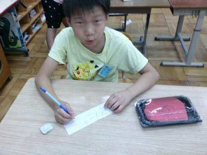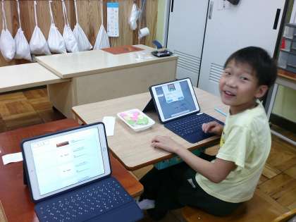 できた商品に、名前・金額。なるほど、ひらがな・かたかな・漢字・数字を頑張って書いています。何も言わなくても、いつもより丁寧に慎重に。5年生はipadを使って、レジを作っていました。できた品物の名前・金額を全て入れてレジは完了。これからこのレジをどのように活用するのでしょうか?まだまだワクワクです。