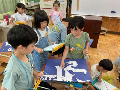 「はさみの切り込みがたくさんあるね!」「紙に穴を開けて、目みたいになってるよ!」などたくさんのすてきなところを見つけることができました。