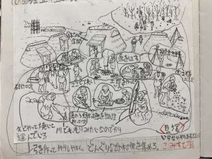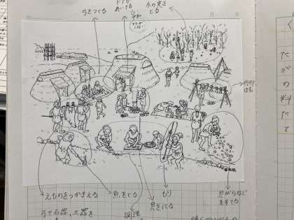 社会科は最初の歴史の単元『縄文のむらから古墳のくにへ』に入りました。はるか昔の縄文時代の暮らし。今とは大きく違う生活様式を、資料から読み取って考えました。どんな暮らしをしていたのかイメージすることができました。