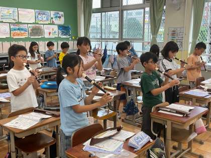 3年生になって初めて学習するリコーダー。指使いやタンギングに苦戦しながらも、楽譜や手本を見ながら一生懸命に取り組んでいます。