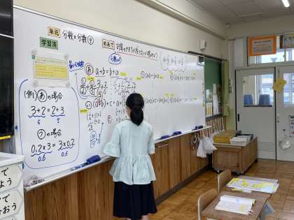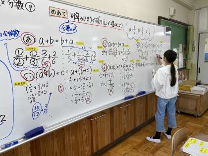 算数科『分数×分数』の単元の中で、これまでに学習した計算の決まりが、分数のときにも使えるのかを確かめました。かけ算だけでなく、たし算やひき算の場合も確かめたので、通分も出てきました。久しぶりでやり方を忘れている人もいると思うので、今日の内容をしっかりと復習しておきましょう!みんなの頑張りのおかげで、分数のときも決まりが使えることを確認することができました。