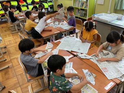 新聞紙や色紙をやぶいたりちぎったりして、どんな形に見えるか友達と話しました。できた形を裏からみたり、上下ひっくり返したりすると、色々なものに見えてきて、とても面白かったです。次の授業では、形から思いついたものをパスで付け足していこうと思っています。どんな作品に仕上がるか楽しみです。