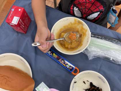 今日は、楽しみにしていた「チキンカレーシチュー」でした。食べていると、中にハッピーキャロットを発見!!3人の子ども達に入っていたようです。何かいいことがありますように!ごちそうさまでした。