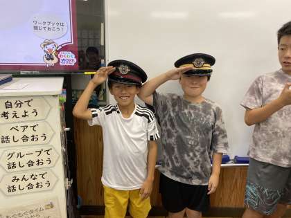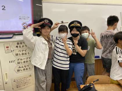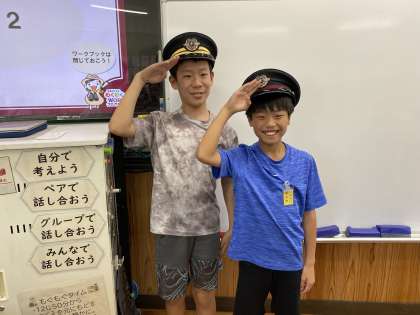 5分休憩の間に、実際に車掌さんがかぶっているものと同じ帽子をかぶらせてもらっていました!みんな、すごく似合っていますね♪