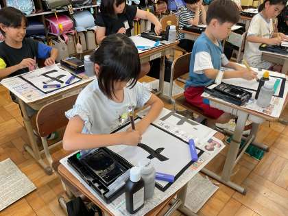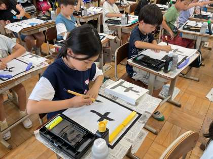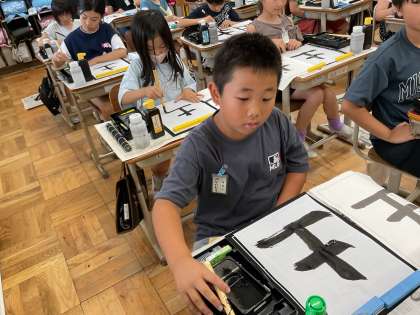 毛筆で「土」を書きました。前回「二」で学習した横画に加え、縦画の書き方や筆遣いを学びました。始筆、終筆に気を付けて書くことができました。