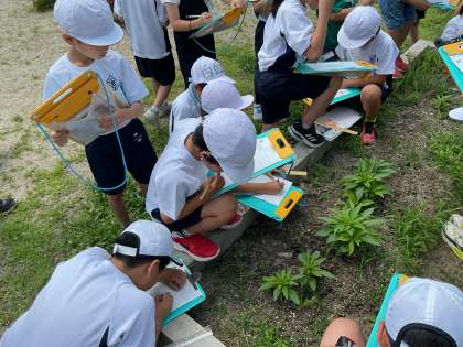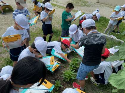 成長したホウセンカの観察をしました。形や大きさ、色の特徴に着目して観察ができました。ヒマワリも急成長!自分の背丈とヒマワリの草丈を比べて驚いていました。