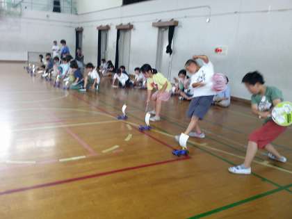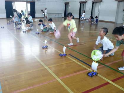 「風とゴムの力のはたらき」という学習で、3年生とうちわであおいで車を走らせました。縦にあおぐ?横にあおぐ?とうちわの使い方を考えながら、できるだけ遠くに走らせようと一生懸命あおいでいました。最後には、頑張った自分をパタパタ。次は、ゴムの力で走らせるそうです。楽しみです。