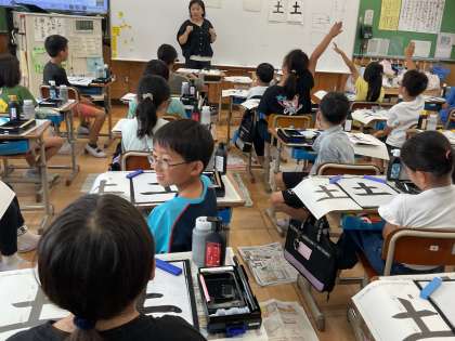毛筆の様子です。穂先をしっかり整えて書いていました。手本をよく見て、集中して取り組んでいます!