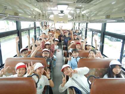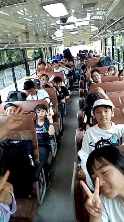 バスの中の様子です。クイズや友達との会話を楽しみながら過ごしています。バスの中から見える自然や山の様子に驚いています。
