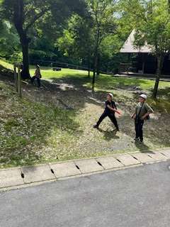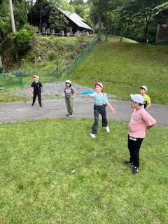 フライングディスクゴルフも、もうすぐ終了となります。1つでも多くのホールをまわろうとみんなで声かけしながら活動しています。