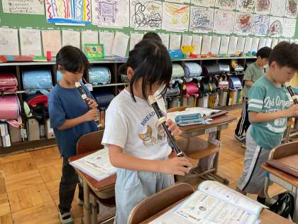 リコーダーでソ・ラ・シを学習して、きれいな音で演奏できるように頑張っています。指づかいやタンギングに気を付けて取り組んでいます。